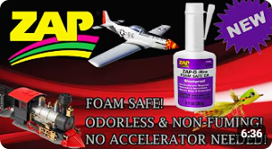 HELPFUL HINTS: ZAP-O FOAM SAFE CA+ is a gap filling formula, however it will penetrate into porous woods and materials, therefore a couple of applications may be necessary to totally fill in a large gap or crack. To speed the cure time ZIP KICKER may be sprayed on the joint after the glue has been applied. Note: ZIP KICKER is not compatible with foam, so if you want to speed the cure time when gluing another material to a foam piece, treat the part you want to glue to the foam with ZIP KICKER AND LET IT DRY, apply the ZAP-O FOAM SAFE CA+ to the foam, then put the other piece on the foam part, hold the pieces in position for several seconds until the glue has cured. ZAP-O FOAM SAFE CA+ will take longer to cure when gluing foam to foam, tape or pin the pieces together and let cure. When using on fiberglass cloth or fabric spread it across the material with an old playing card, business card, or a soft plastic spreader. For critical applications test sample joints for designed strength requirements. Note: ZAP-O FOAM SAFE CA+ is a great alternative to those individuals that have reactions to the fumes given off by regular CA type glues. In rare cases some individuals may still have a reaction to ZAP-O FOAM SAFE CA+. If you do, discontinue use immediately, see your physician or allergist, you may be allergic to one or more of the chemicals common to all CA glues.